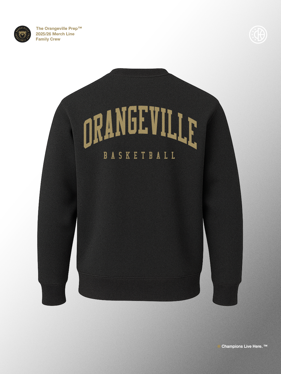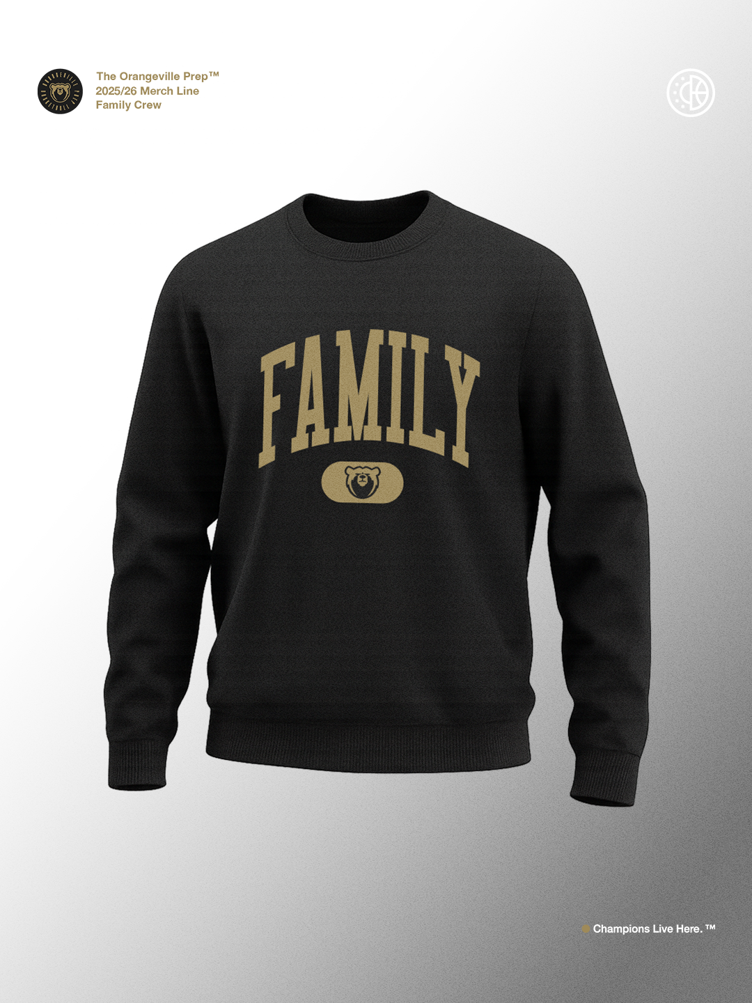 Unisex black sweatshirt with FAMILY print on front and ORANGEVILLE print on front.